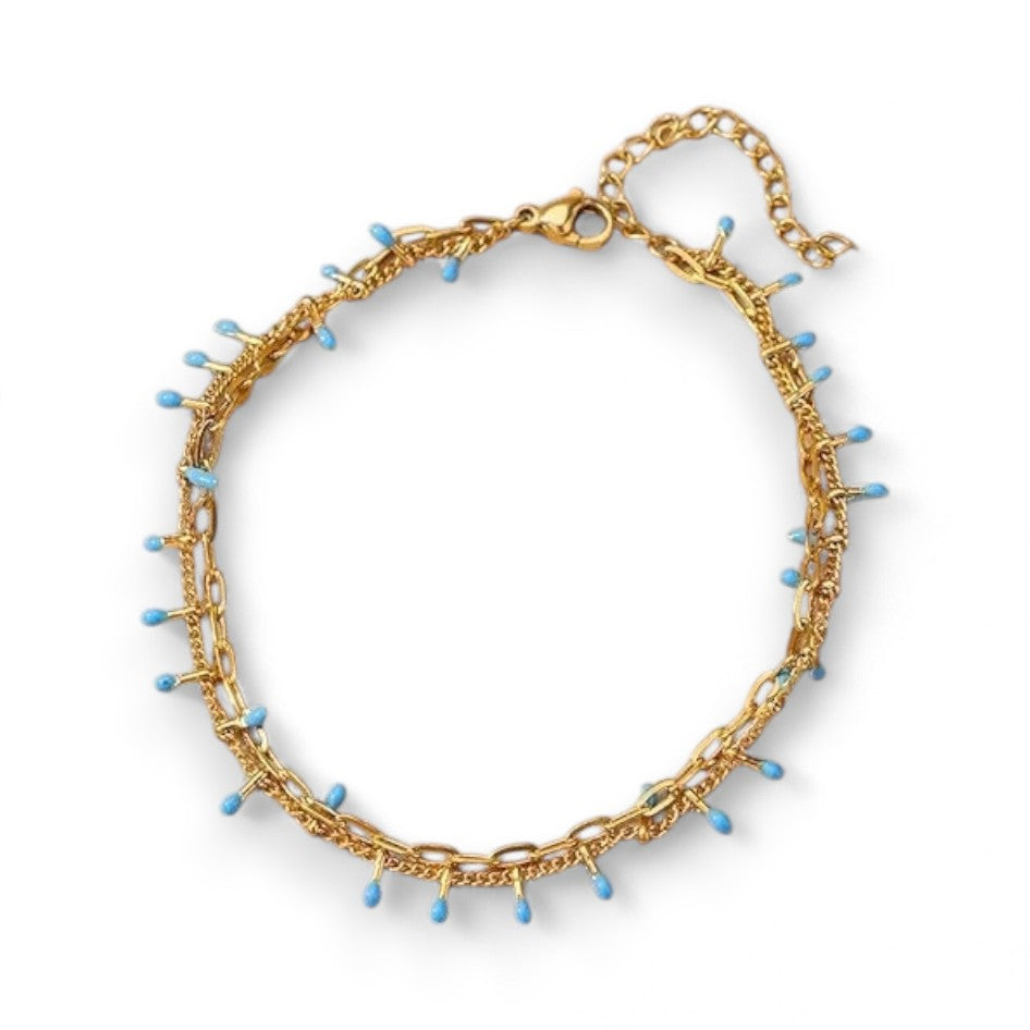 Beachy, bold, and ready for your summer adventures - this anklet features a gold‑plated paperclip chain dotted with ocean‑inspired blue droplets. A tiny splash of seaside sparkle to lift every step.