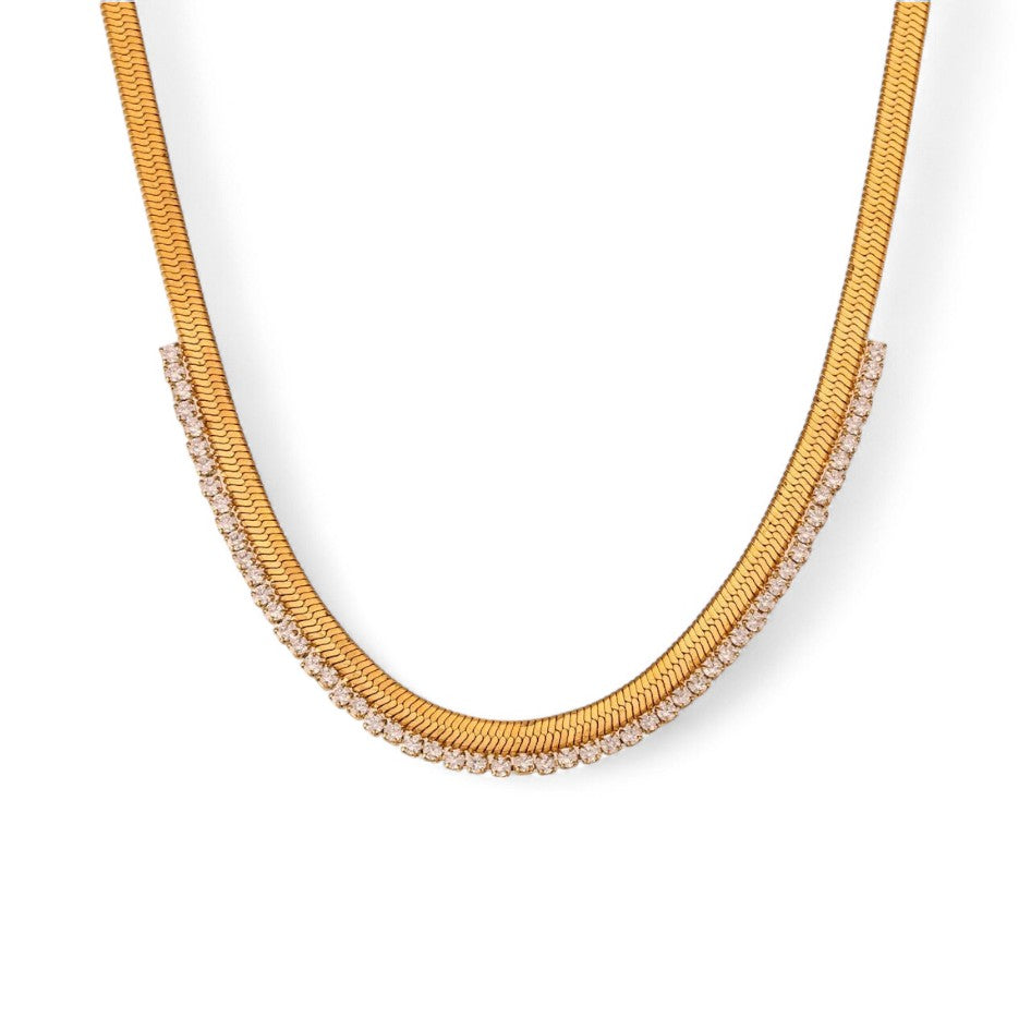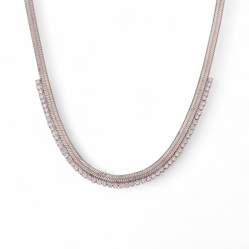 Radiant yet refined, the Glimmer Herringbone Necklace is your everyday essential - perfect for workdays and evening plans alike. The sleek herringbone chain first hugs the collarbone, then cascades into a line of shimmering cubic zirconia, ensuring you catch the light with every move.