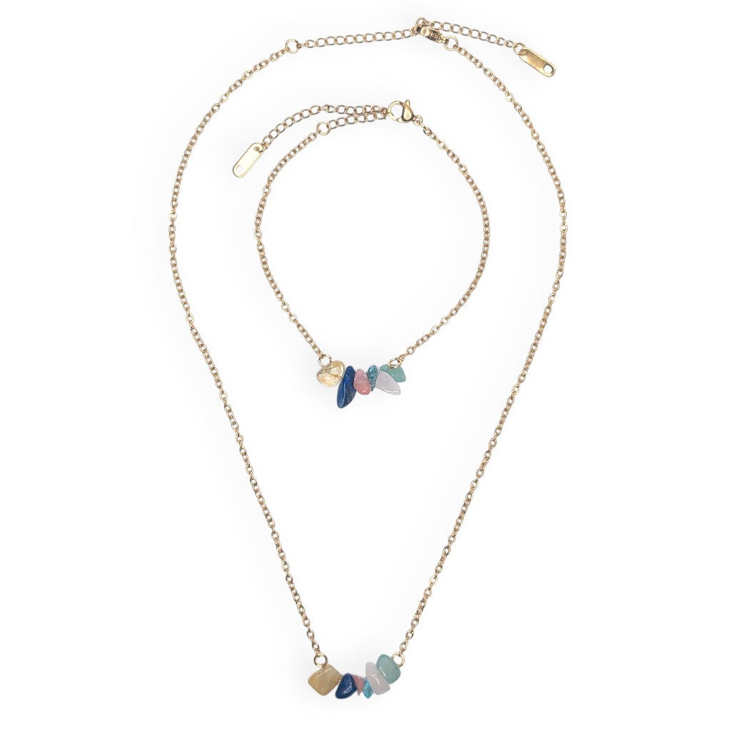 Add a soft streak of everyday sparkle to your look with the Lottie Gemstone Necklace, your go-to piece that effortlessly bridges coffee runs and desert sets. Delicate faceted gemstones sit on a gold-plated, waterproof stainless steel chain, keeping you gleaming from desk to dancefloor.
