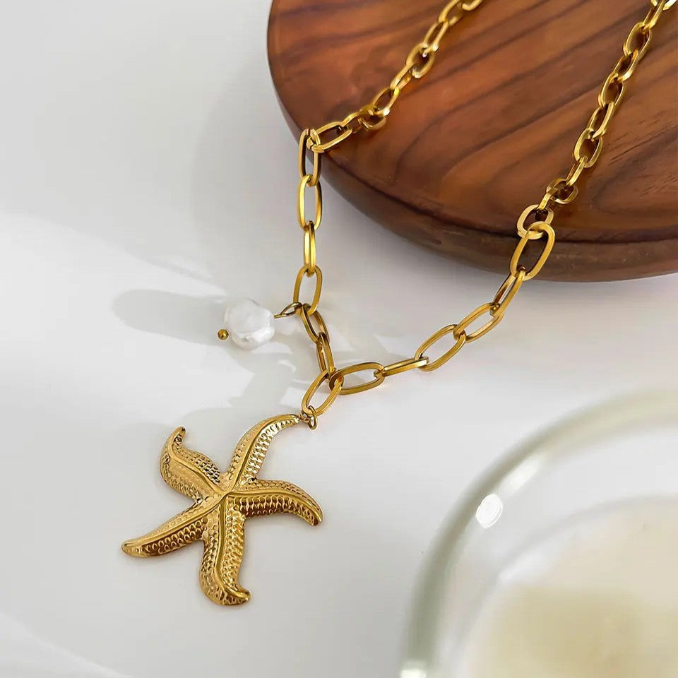 The Mara Necklace features a charming starfish pendant and pearl drop on a paperclip-style, adjustable gold-plated chain. Fully waterproof and tarnish-free, this versatile piece brings coastal elegance into everything you do, from desk days to sunset shows