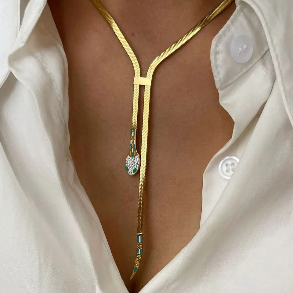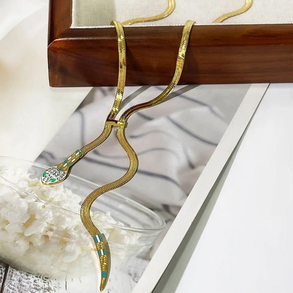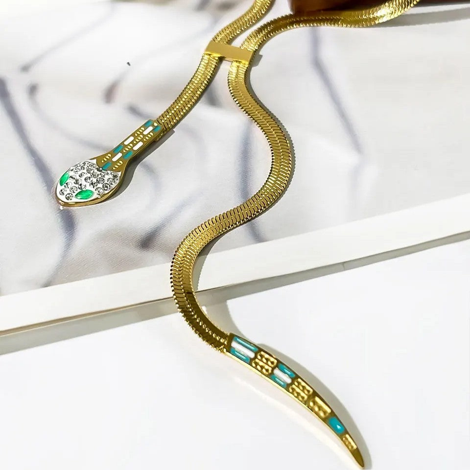 Sleek, symbolic, and effortlessly cool. This 18ct gold-plated stainless steel necklace features a sinuous snake design adorned with sparkling cubic zirconia eyes. A bold statement piece that adds edge and elegance to any outfit.