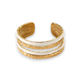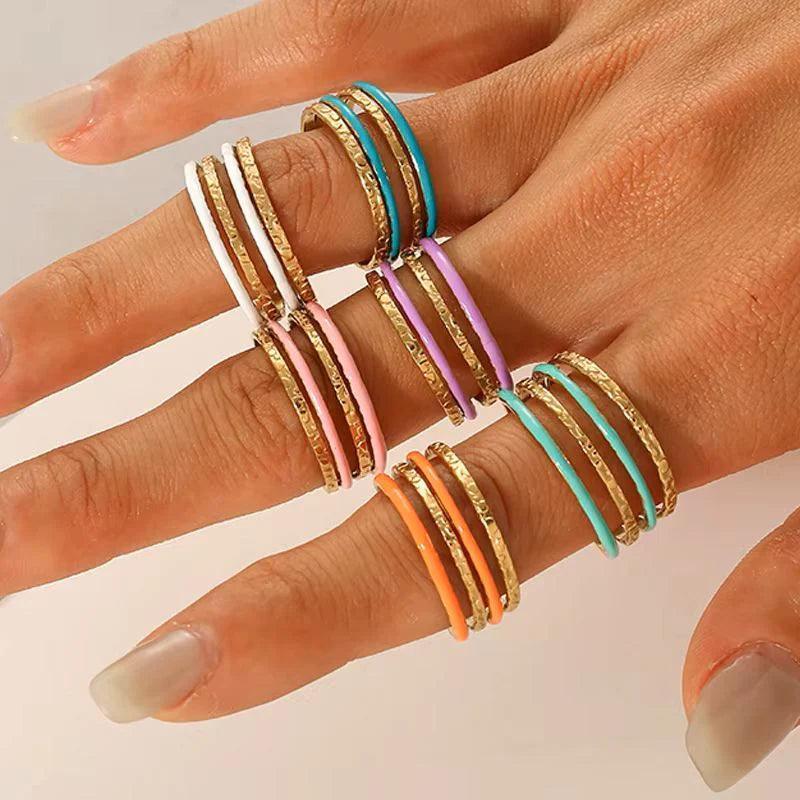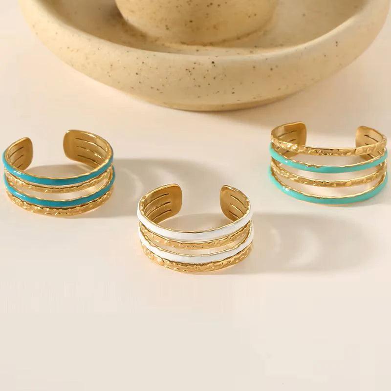 The Chelsea Multi‑Layer Ring features three interconnected bands that effortlessly wrap around your finger, mimicking a stacked look in a single piece. Crafted from waterproof 18 ct gold‑plated stainless steel with coloured enamel, fully adjustable, it offers chic versatility and lightweight charm, perfect for every day, every mood.