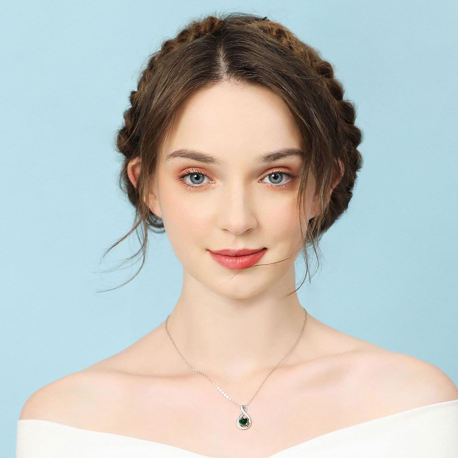 Our stunning May Birthstone Emerald Infinity Pendant Necklace, made from 925 sterling silver and adorned with emerald green and clear cubic zirconia.