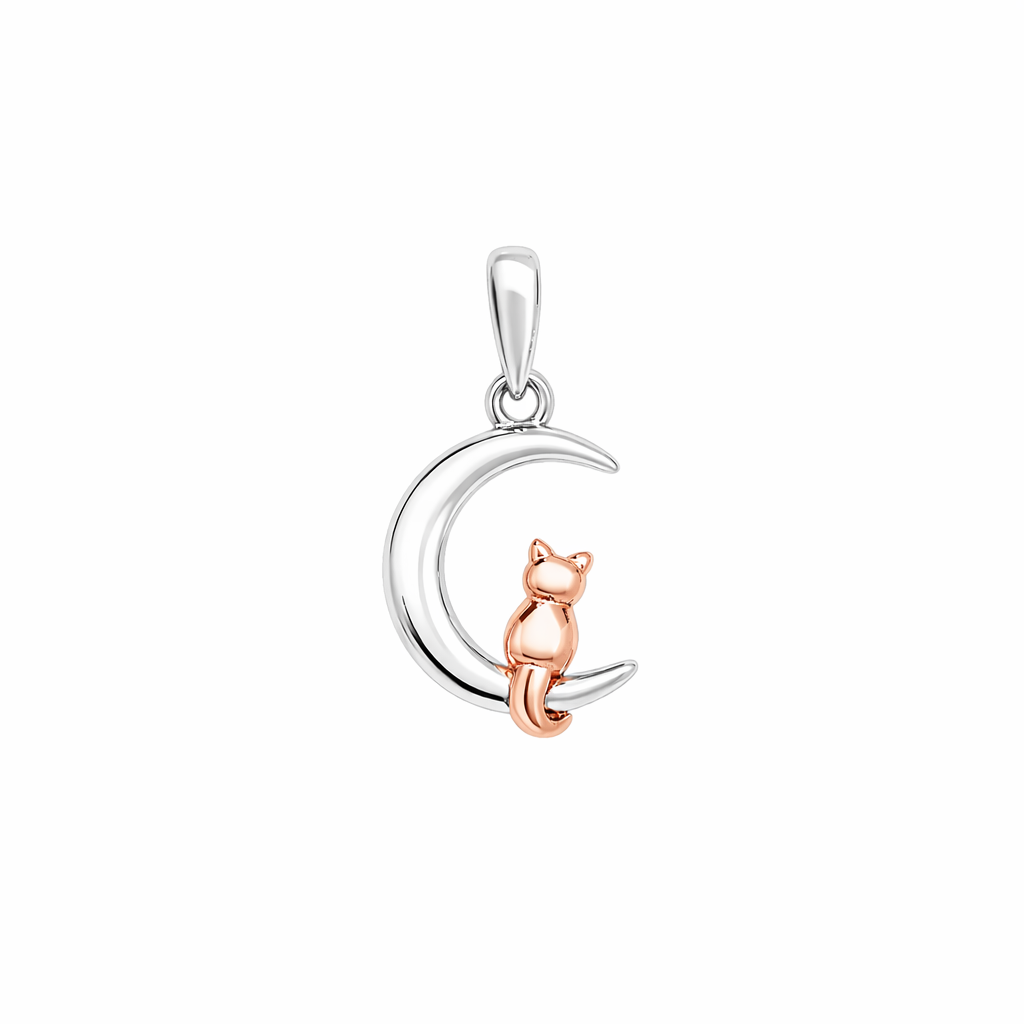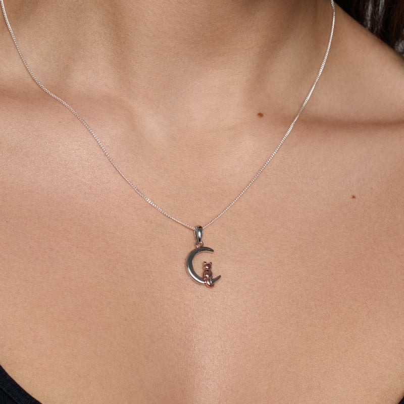 Charming and full of character, the Cat On Moon Pendant Necklace is a whimsical piece with a touch of elegance. Crafted from polished sterling silver, this delicate necklace features a graceful crescent moon with a sweet rose gold plated cat sitting quietly within it, creating a beautifully balanced two-tone design.