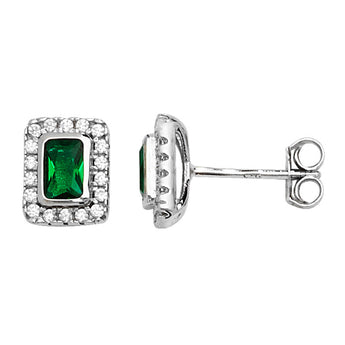 Emerald Rectangle Halo Stud earrings. Made with emerald and clear cubic zirconia, set in 925 sterling silver.