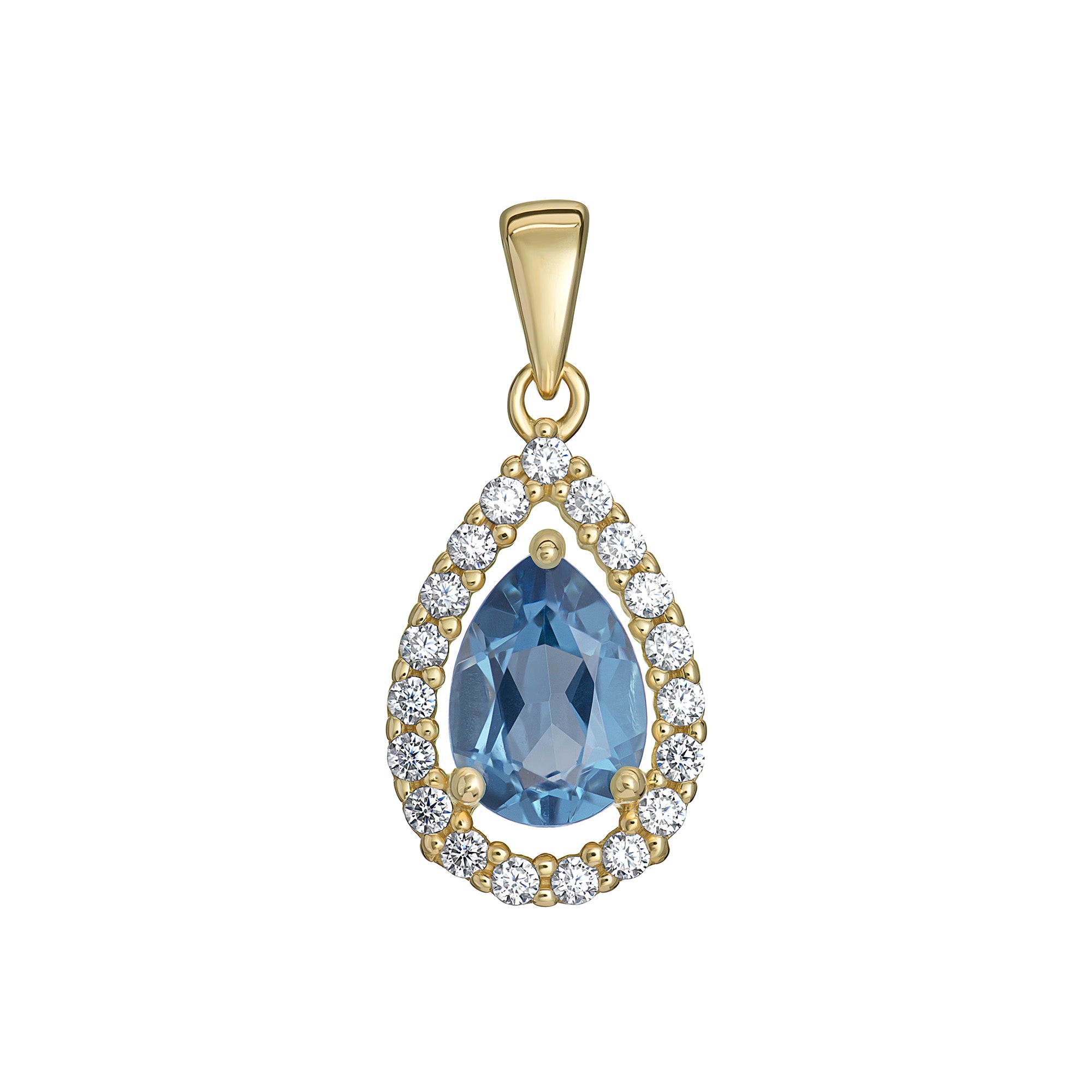 • Stones: Teardrop-cut Blue Topaz Cubic Zirconia with Clear Cubic Zirconia halo