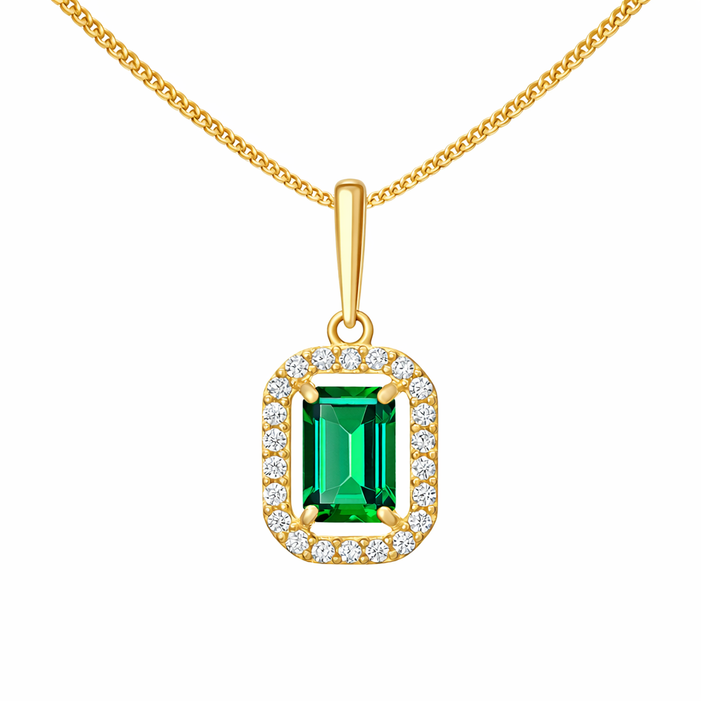 Emerald Cut Cubic Zirconia Pendant Necklace. Made with an emerald cut cubic zirconia halo design, set in 9ct gold, presented on a elegant 9ct gold curb chain.