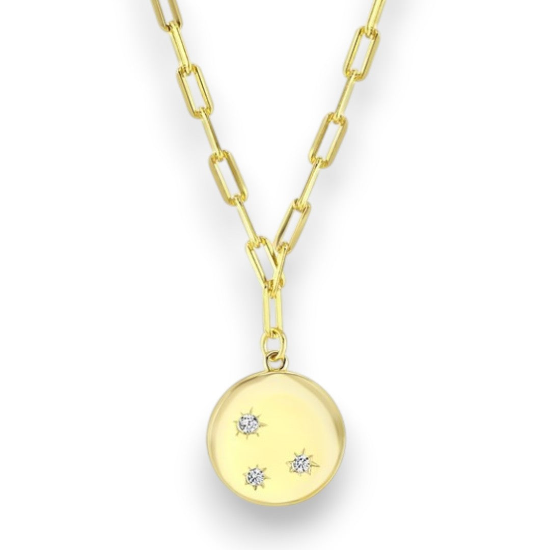 Our Paperclip Disc Necklace. Made with 925 sterling siver and layered with 9ct gold plating and adorned with sparkling Cubic Zirconia.