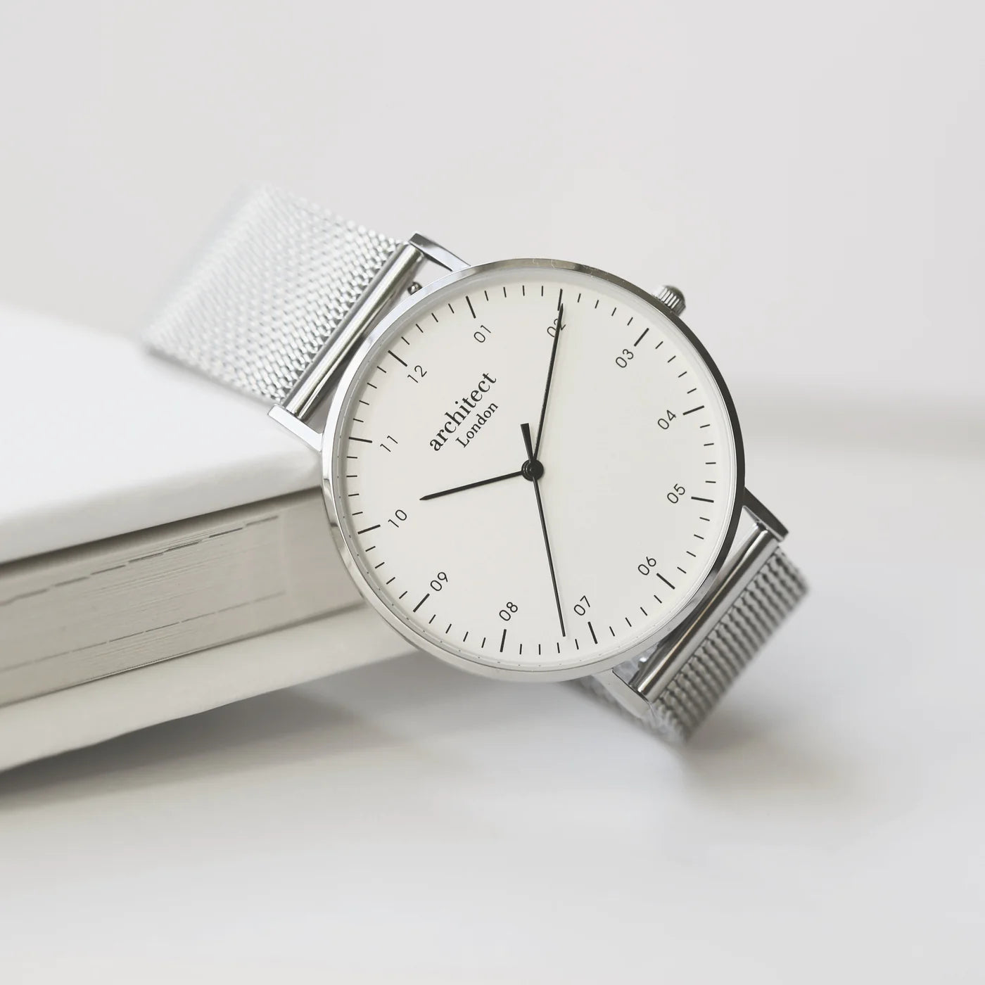 Men's Modern Font Engraved Architect Zephyr Watch - Steel Silver Mesh Strap