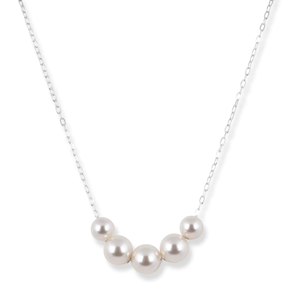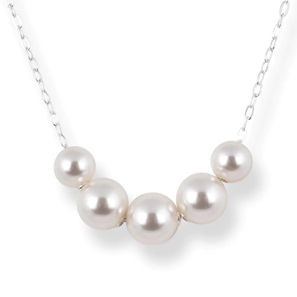 Our Pearl Bead Necklace, Crafted with 925 sterling silver is a chain that delicately holds a set of 5 stunning synthetic pearls.