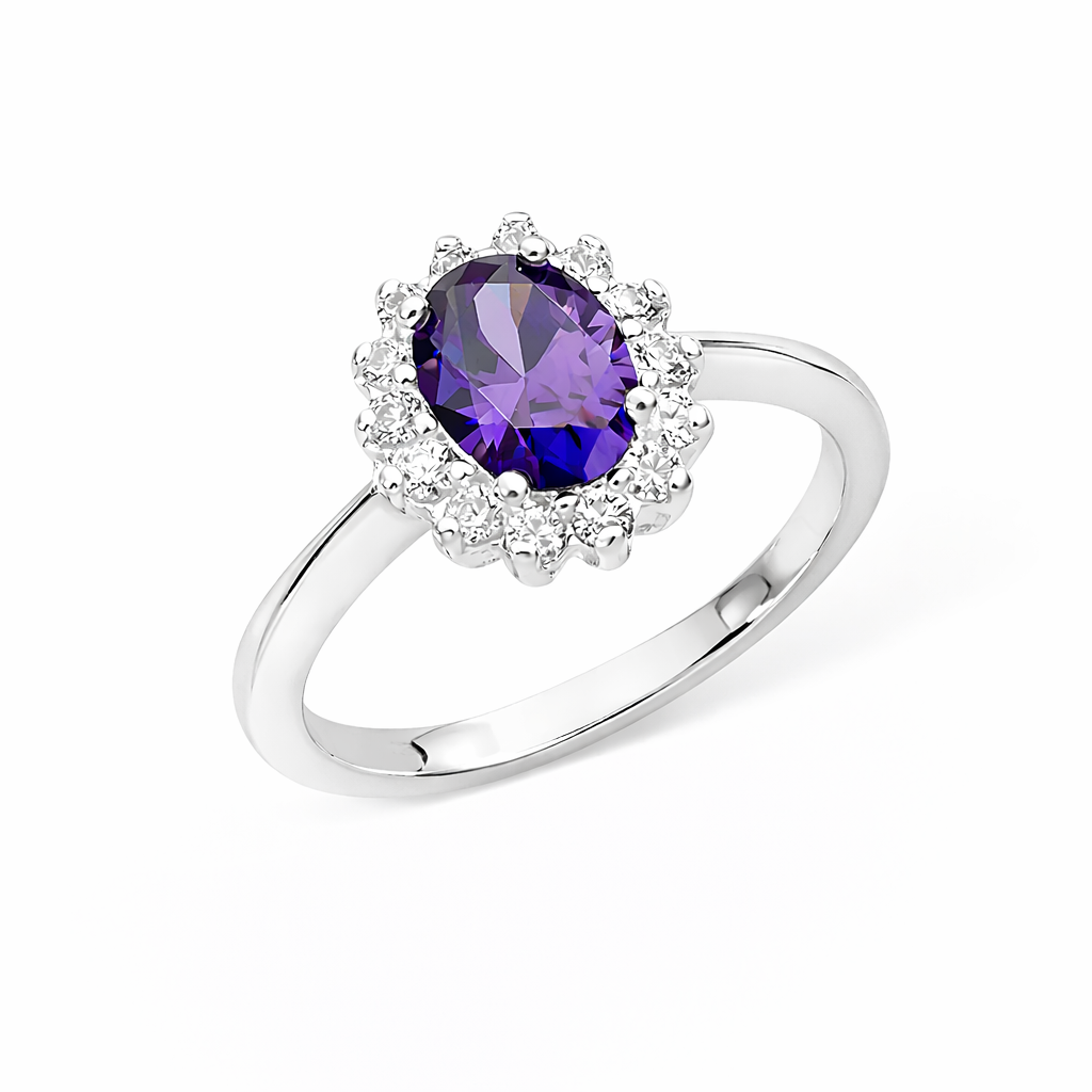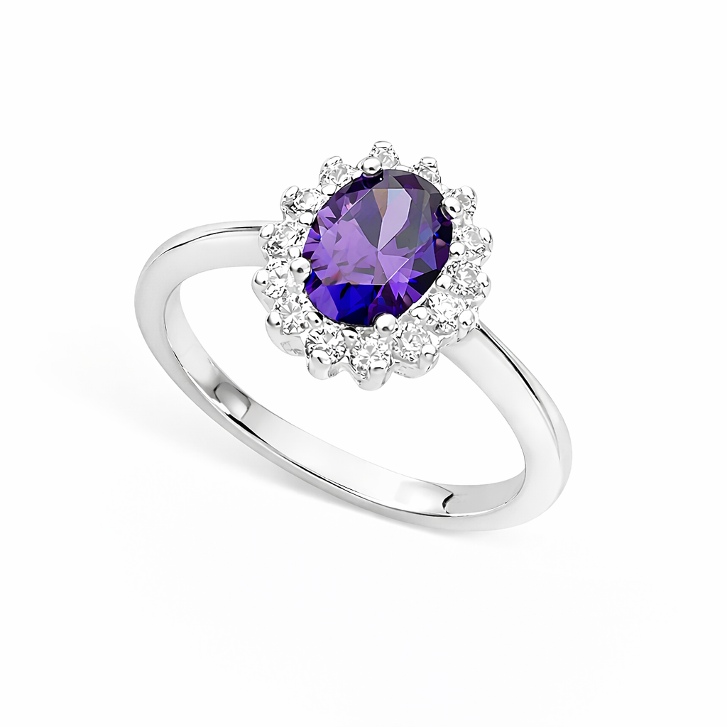 Bring bold colour and radiant sparkle to your jewellery collection with our Silver Amethyst CZ Cluster Ring. Crafted from polished sterling silver, this striking ring features a  shimmering amethyst coloured cubic zirconia stone at the centre surrounded by a cluster of clear cubic zirconia's - arranged to create stunning brilliance and texture. The rich purple hue stand out beautifully against the sleek silver setting, giving a look that’s both vibrant and elegant.
