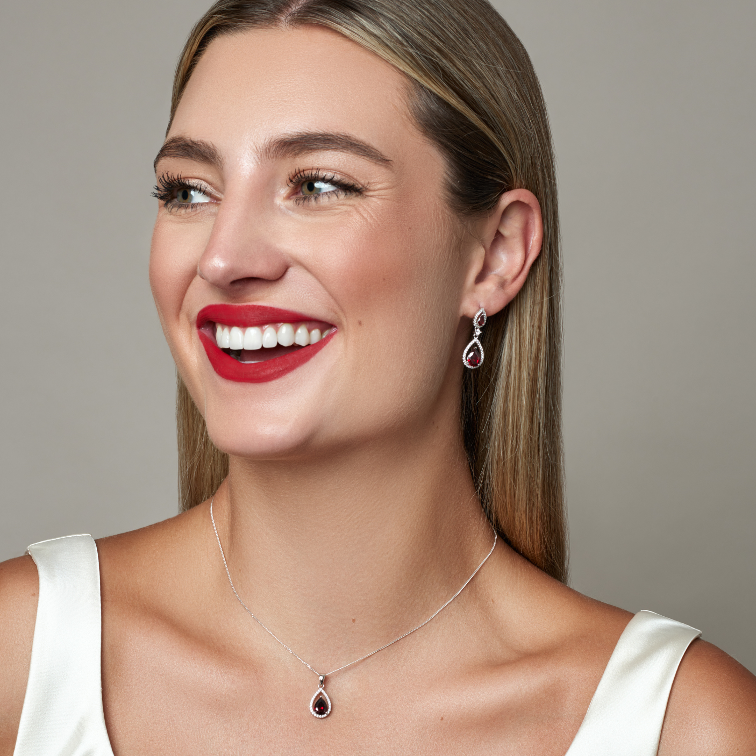 Our Ruby Cubic Zirconia Sterling Silver Teardrop Drop Necklace. This stunning piece features a deep ruby red cubic zirconia and a delicate silver chain.