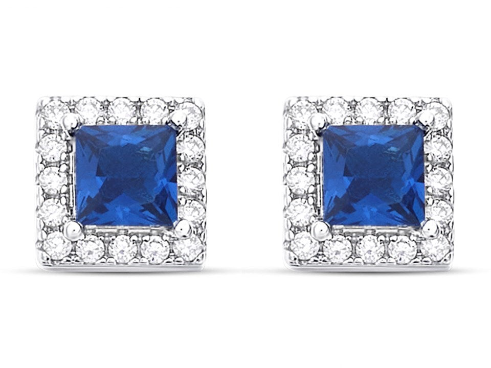 Our Princess Cut Sapphire stud Earrings. Made with sapphire cubic zirconia, surrounded by a halo of sparkling cubic zirconia, all set in 925 sterling silver.