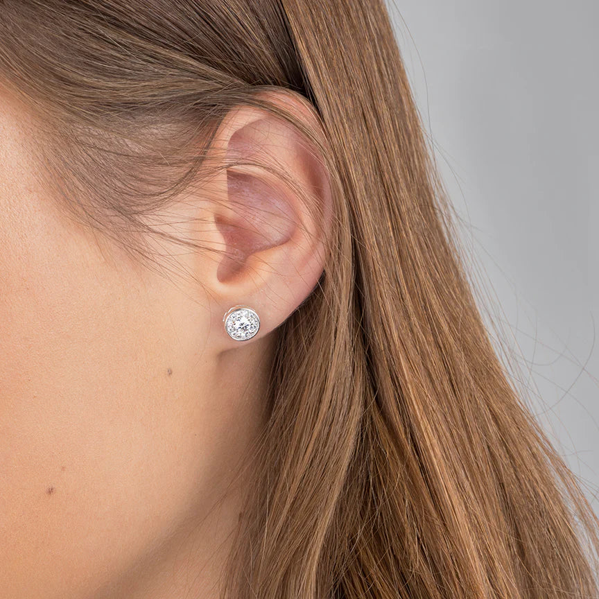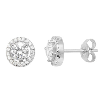 Crafted with high-quality sterling silver, These elegant silver studs feature a sparkling round cubic zirconia surrounded by a halo of smaller cubic zirconia stones.