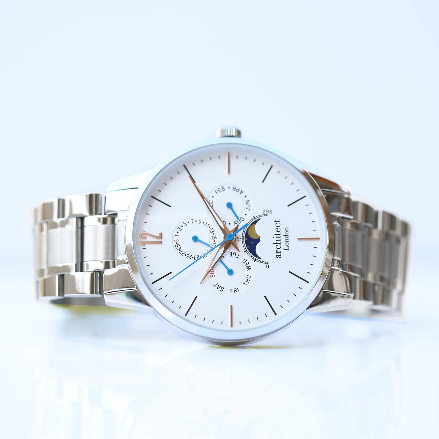 This stunning moonphase watch displays the sunlit portion of the moon as observed from Earth. Additionally, the three chronograph subdials are the perfect complement to the complexity of this timepiece. The Apollo watch has at its heart Japanese movement for incredible accuracy.