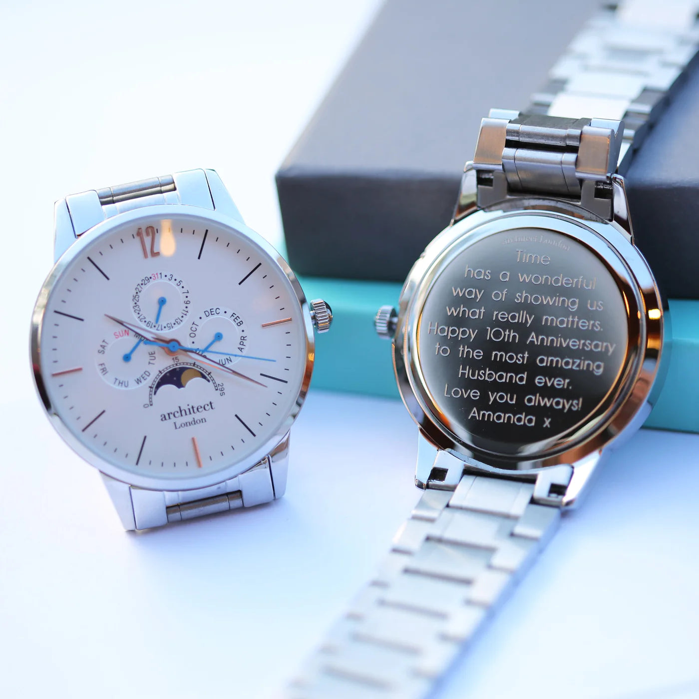 The back of the watch was specifically designed to have the ideal space for an engraved message of your choice. Just provide us with your wording and we will perfectly engrave it using a modern font. The Architect Apollo has a huge 32mm x 30mm engravable area where your engraved message can have up to 216 characters of text over 10 lines.